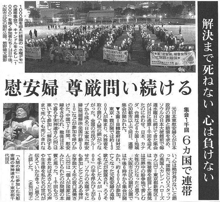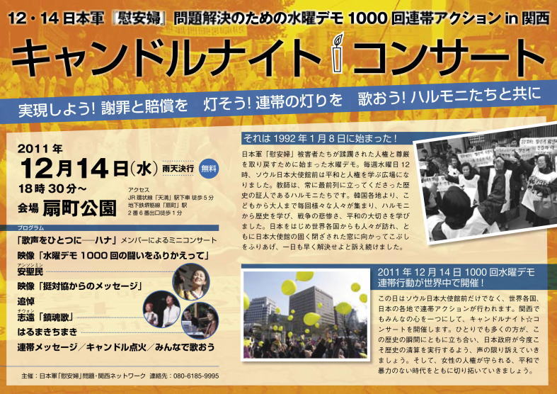 関西ネットワークでは、韓国水曜デモが1000回を迎える12月14日にどのようなかたちで連帯できるかということを話合い、「1000回の運動の重みを振り返りたい」「被害者たちが生存しているうちに解決をみる最後のチャンスだという思いをひとつにしたい」「多くの人に『慰安婦』問題に関心をもってもらいたい」「幅広い年齢層、幅広い運動の人たちと『慰安婦』問題を共有したい」等々の思いがまとまりました。