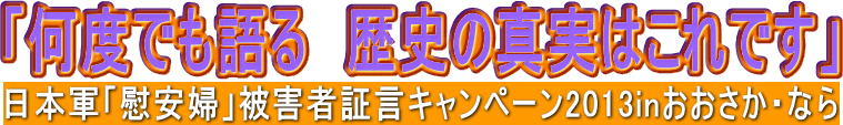 2013年5月25日(土)は大阪ドーンセンターで、5月26日(日)は奈良県人権センターで、金福童ハルモニと吉元玉ハルモニをお迎えして集会を開催しました。奈良集会は、関西ネットの他、アイ女性会議なら、多文化共生フォーラム奈良、部落解放同盟奈良県連合会女性部の4者での共催です。25日の大阪集会は会場の定員である500人を遥かに超える人が詰めかけ、申し訳ありませんが多くの方にお帰りいただく結果となってしまいました。26日の奈良集会には、やはり会場を埋め尽くす500人もの方にご参加いただきました。