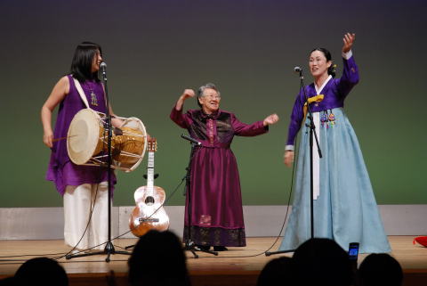 また、大阪集会では、李政美さん、安聖民さんの歌が、ハルモニたちの心に寄り添い、とても感銘を与えてくれました。韓国から日本に渡ってきた在日1世たちと同じように、故郷を離れ北間島に移り住んだ同胞の間で歌われた「サンヂュアリラン」を安聖民さんが歌い、植民地朝鮮で祖国の解放を願い地下水脈のように歌いつながれた「鳳仙花」を李政美さんが歌い、そして2人で「ミリャンアリラン」を歌ったとき吉元玉ハルモニは恥ずかしそうに舞台に現れて一緒に歌い踊った瞬間、会場は感動に包まれました。