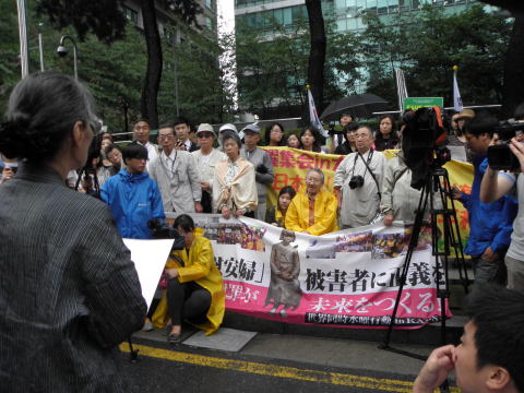 9月11日、私たち関西ネットは、被害者とともに日本政府に解決を迫るために、ソウルの1091回目の「水曜デモ」に参加して来ました。その日はあいにく、朝から雨降りの一日でした。しかし、「水曜デモ」が行われた1時間の間は、なんと、雨があがっていたのです。84歳の吉元玉ハルモニが、日本大使館に向かって、座られました。少女像「平和の碑」を取り囲むように、300名もの市民が集まり、多くの人がハルモニに挨拶をしていました。過酷な「慰安婦」制度の被害者のハルモニが勇気を持って立ちあがられ、このようなことが二度と繰り返されないようにと闘い続けておられることに対し、多くの人々が暖かい尊敬の念を持っていることがよく伺えました。いつも、一緒に参加される金福童ハルモニは、86歳というご高齢にもかかわらず、この日は、国連でのアピール活動のために、スイスのジュネーブに行かれていました。