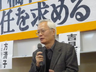 中国人強制連行受難者追悼会の冠木克彦弁護士から、特定秘密保護法についての特別アピールがありました。安全保障の問題にとどまらず、戦争責任を追及する者にとっても事実が隠蔽されるということ、そして市民運動の活動が制限され、また密告社会になる危険を指摘しました。集会後まもなくして、特定秘密保護法は成立しましたが、日本軍「慰安婦」問題と同様、闘いはまだ終わっているわけではありません。