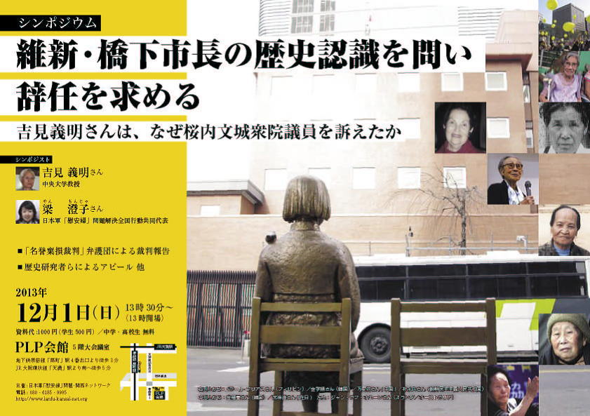 2013年12月1日、大阪PLP会館において、シンポジウム「維新・橋下市長の歴史認識を問い辞任を求める 〜吉見義明さんは、なぜ桜内文城衆院議員を訴えたか〜」を、日本軍「慰安婦」関西ネットワーク主催で開催しました。シンポジストとして、裁判の原告であり中央大学の教授である吉見義明さんと、日本軍「慰安婦」問題解決全国行動の共同代表である梁澄子さんをお迎えして、橋下発言の歴史認識の醜悪さを、具体的に明らかにしました。当日は約190人の参加者を得て、まさしく橋下市長を批判する大集会となりました。