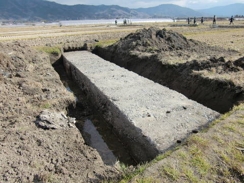 柳本飛行場に作られた滑走路は、幅100m、長さ1500mと大規模なものでした。滑走路は二本作られる予定でしたが、敗戦で一本だけに留まりました。米軍が接収した後、元の農地に戻され、滑走路の両側には滑走路への地下水の侵入を防ぐために暗渠による水路が設けられましたが、その暗渠は今も田んぼの中に残されています。