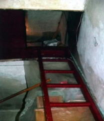 最初は3階建てだと言っていたんです。法廷の頃の資料に3階建ての建物に入れられたと書いてしまったんですが、行ってみて分かったのは、2階建てなんです。なぜ3階建てと言ったのか理由が分かったんですが、朴さんが「あそこだあそこだ」って指さすんですね。自分が入れられた19号室の廊下をはさんだ向かいの部屋に入った時、上に屋根裏部屋に続く梯子があったんです。「ここに入れられたんだ」と朴さんが指を指しているところです。ここに梯子あって上に上がれます。朴さんは気が強くて抵抗したり暴れたりしたのでこの拷問部屋に閉じこめられて、言うこと聞くまで食べ物も水ももらえず閉じ込められた。その部屋が、朴さんの言うところの3階建てで、本当に狭い部屋でした。