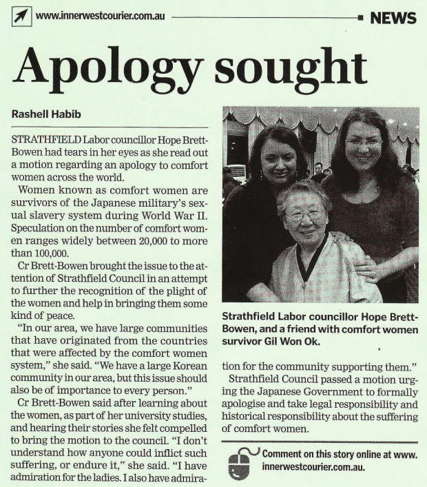 国際社会での日本軍‘慰安婦’問題解決のための努力は、現在も日々新しい連帯と支持の幅を広げ続けており、日本の宝塚と清瀬市議会での意見書可決を皮切りに、日本政府次元の対応を要求する市議会請願提出運動も活発に繰り広げられている。これ以上遅くなる前に、国民を代表する国会議員の役割を通じ、法律的で政策的な解決努力が可視化されるに従い被害当事国政府と犯罪の主体である日本政府が一日も早く問題解決のため前面に立たなければならない。