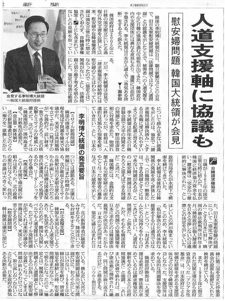 26日付の朝日新聞コラムでは、先週国内外マスコミ共同記者会見での李大統領の「法律より人道的な問題として解決すべきだ」との発言に対し、慰安婦団体からの反発は覚悟のうえに違いないと指摘した。憲法裁判所違憲決定を守るどころか、日本政府に配慮し反発を予想しながらも被害者の期待を裏切る李明博大統領の発言は、全韓国国民からの批判を免れないだろう。