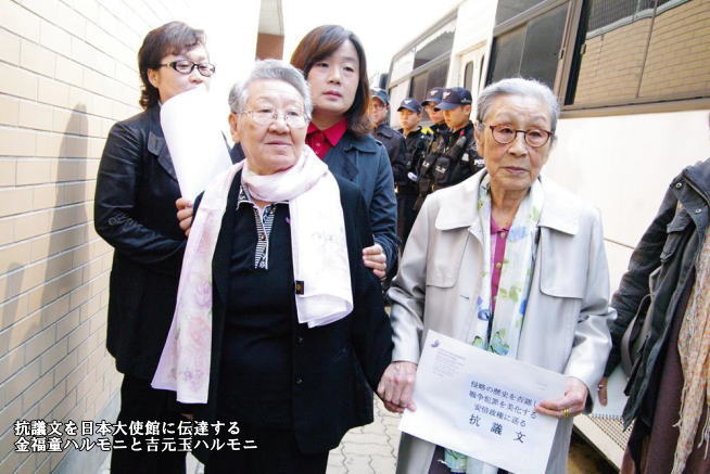 多数の女性の名誉と尊厳を深く傷つけた主体が日本軍であり、彼女たちを性奴隷にし、人権を蹂躙した犯罪認め、一日も速く日本軍「慰安婦」制度に対する全貌を調査・公開し、被害者たちの前に公式謝罪と賠償責任を履行しなければならない!