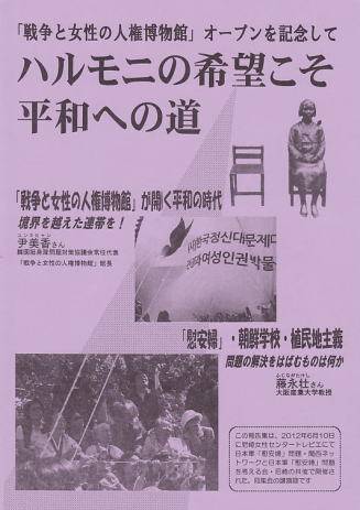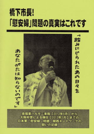あれから3ヶ月を経て、もはやその機会がないのではと思っていた、「慰安婦」被害者であった金福童ハルモニが尹美香さんとともに関西の地を訪れ、橋下市長の「慰安婦」問題発言に「NO!」を突きつける、重要な局面に立ちあって頂くことになりました。その日にこのパンフレットを世に送り出すことになったことは、大きな意味があると考えます。