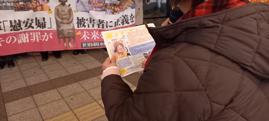 「水曜デモをごぞんじですか」の歌のあと、「関西ネットからの報告」では、 昨年10月に撤去されたベルリン少女像「アリ」が3か月を経て元の場所からほど近いアートセンターの許可を得て帰ってきたことを報告、日本政府の執拗な圧力と闘う現地市民らへの連帯の意志を伝えました。