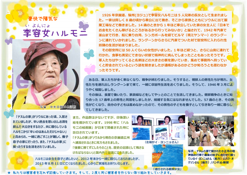 1926年京畿道生まれ、1942年に騙されてラングーンに連れて行かれ、性奴隷とされたハルモニは、絵画作品も残され、1998年に「ハルモニの絵画展」日本開催の折に訪日されました。