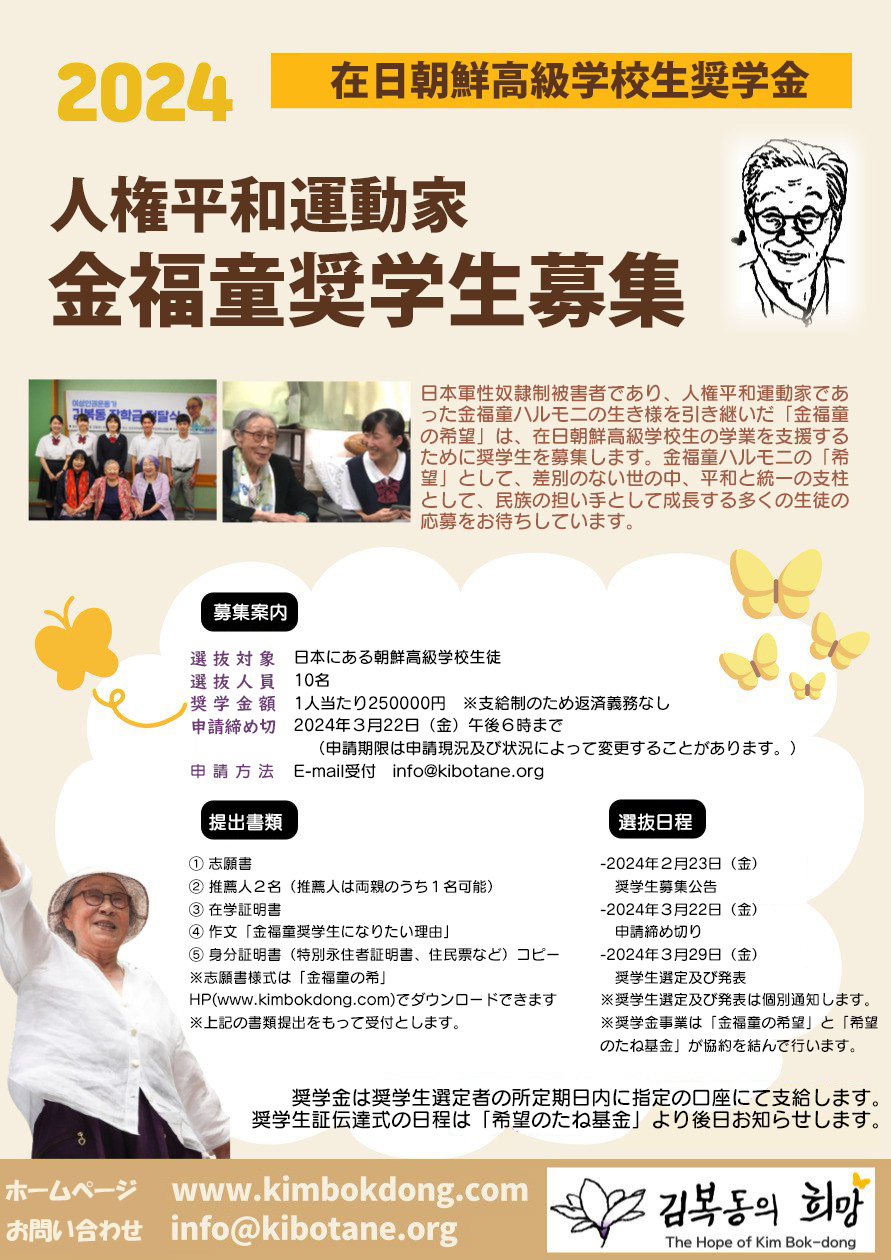 日本軍性奴隷制被害者であり、人権平和運動家であった金福童ハルモニの生き様を引き継いだ「金福童の希望」は、在日朝鮮高級学校生の学業を支援するために奨学生を募集します。